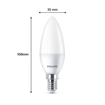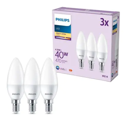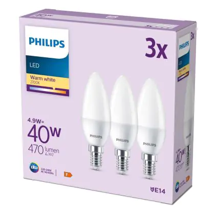 Die Mehrfachpackung 3x Philips Glühbirne LED E14 Kerze Matt 5W 470lm - 827 Extra Warmweiß ist eine effiziente E14 LED-Lampe und der perfekte Ersatz für Ihre konventionellen W Lampen mit E14-Sockel. Zudem strahlt sie Licht in der Farbtemperatur 2700K - Extra Warmweiß aus und punktet durch eine lange Lebensdauer.
