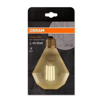 Die Osram Vintage 1906 LED E27 Diamond 4.5W 825 Gold | Ersetzt 40W ermöglicht enorme Energieeinsparungen von bis zu 90 %. Dank des Standard-E27-Sockels klappt der Umstieg auf LED besonders einfach. Die Goldbeschichtung und die sichtbaren Filamentstäbe im Inneren des Leuchtkörpers machen die Vintage-LED zu einem echten Highlight. Der Leuchtkörper ist begeistert mit einer Diamant-Form.