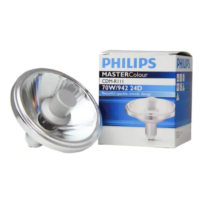Die Philips CDM-R111 70W 942 GX8.5 24D (MASTERColour) Entladungslampen haben einen sehr guten Farbwiedergabeindex von 90-100Ra. Diese Lampe spendet ein helles weißes Licht (4200K). Der UV-Filter sorgt dafür, dass wärmeempfindliche Objekte keinen Schaden tragen und sich nicht verfärben.